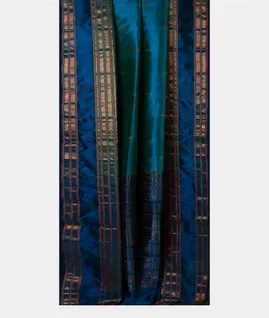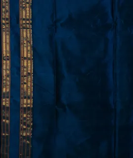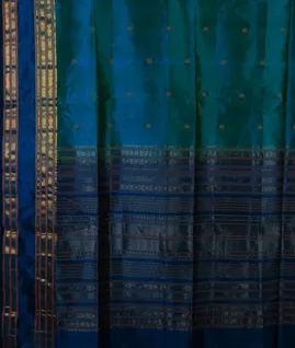 This silk cotton saree has a blue body with gold zari checks and buttas all over. This saree is accompanied with a contrasting blouse.