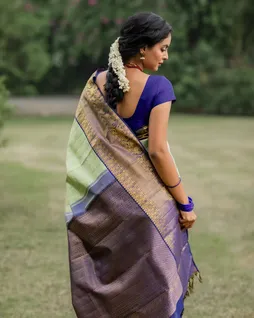 Delicate Green Handwoven Kanjivaram Saree with Pure Zari and Veldhari on the Body, Along with traditional Border.